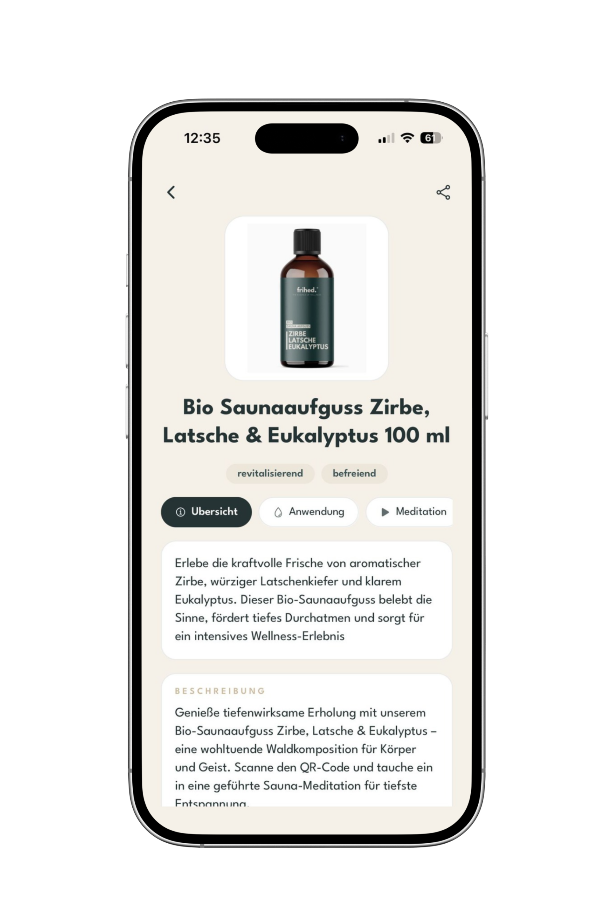 Wir bei frihed. sind stolz, dir eine echte Innovation zu präsentieren: die erste App, die deine Sauna- und Wellnessmomente mit geführten Meditationen verbindet. Unsere hochwertigen Aufgüsse und Duftsprays sind jetzt noch mehr als nur Düfte – sie werden zu einem ganzheitlichen Erlebnis für Körper und Geist. Einfach scannen, entspannen und genießen!